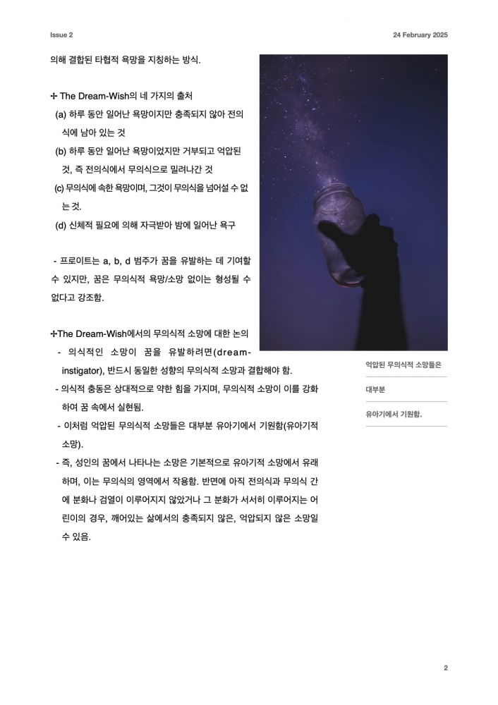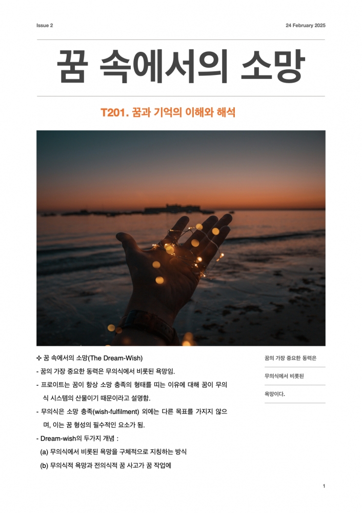 <정신분석강의> 꿈이 우리의 소망이라면![]() ![]() ![]() 정신분석에서 무의식을 탐색할 수 있는 가장 왕도의 길이 꿈을 분석하는 일이라고 합니다. 꿈은 우리에게 무엇을 알려주고 있을까요? https://blog.naver.com/icp-korea/223772055370 에서 더 많은 정신분석 강의 내용을 보실 수 있습니다. |