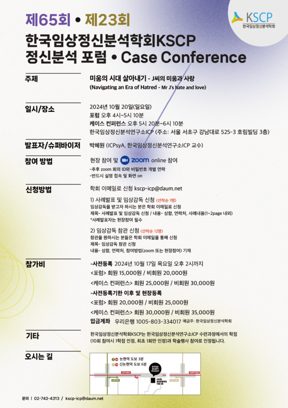 한국임상정신분석학회KSCP의 제65회 포럼 및 제23회 케이스 컨퍼런스가 열립니다.