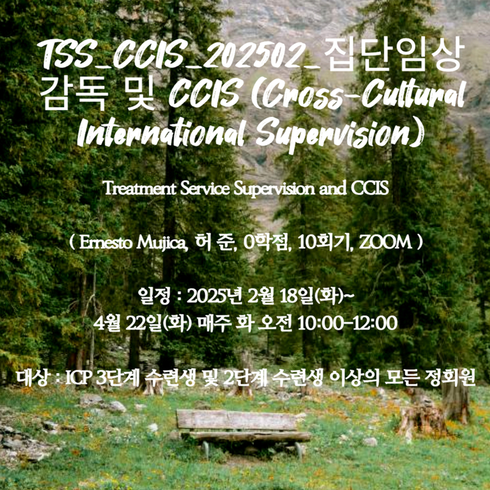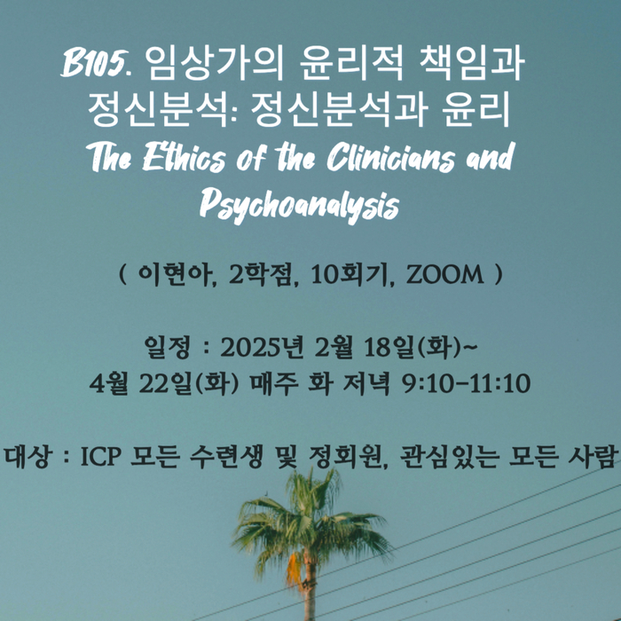 2025년 1학기 한국임상정신분석연구소ICP 수강 안내![]() ![]() ![]() ![]() ![]() ![]() ![]() ![]() ![]() 자세한 내용은 연구소 공식 블로그 혹은 홈페이지를 참고해 주세요. 1. 한국임상정신분석연구소ICP 홈페이지 https://icp-korea.net/courses/ 2. 한국임상정신분석연구소ICP 공식블로그 https://blog.naver.com/icp-korea/223716125158 |